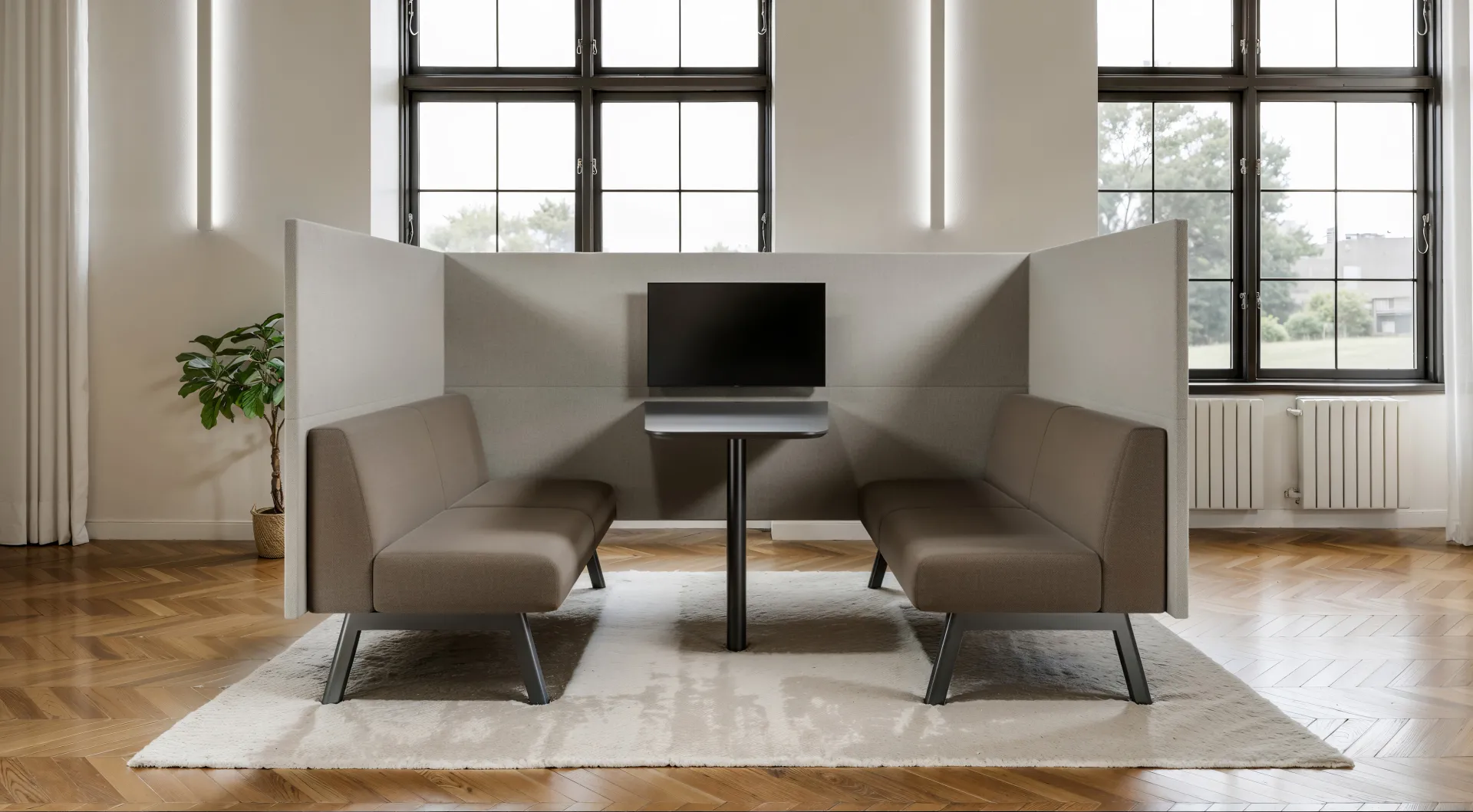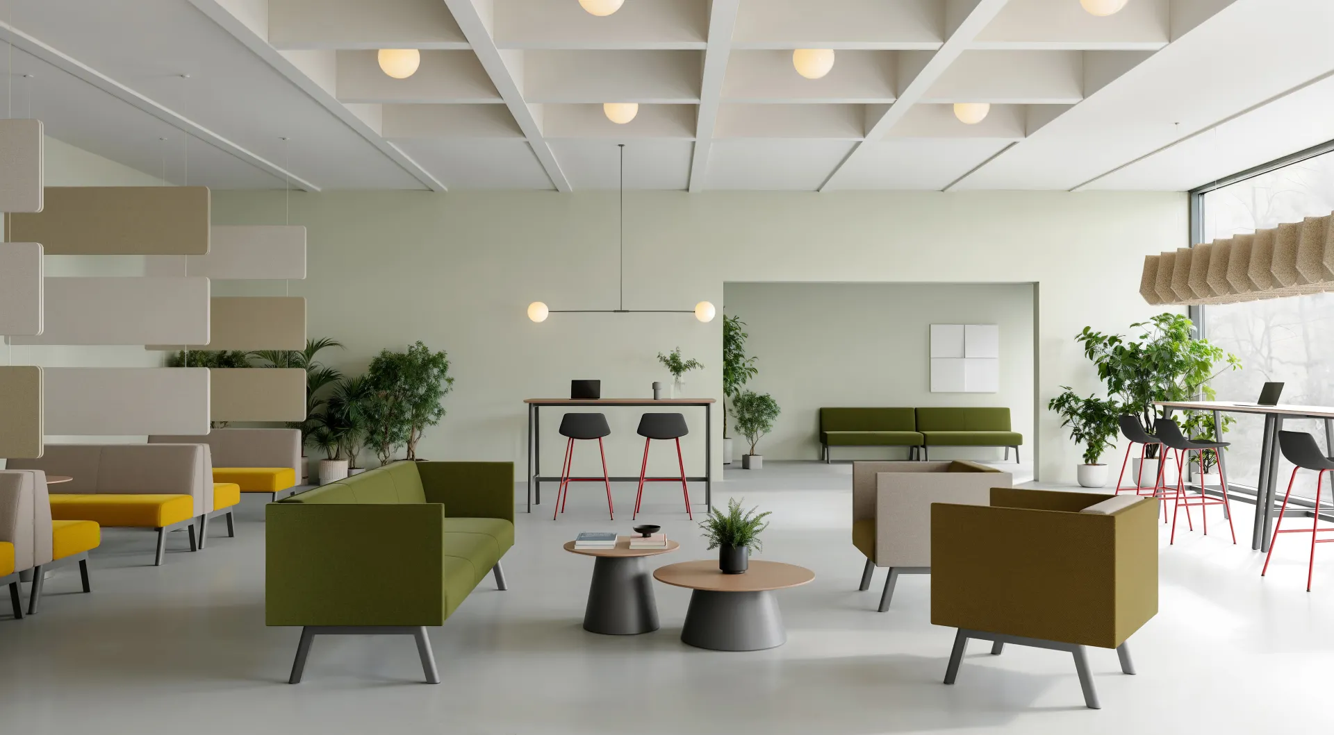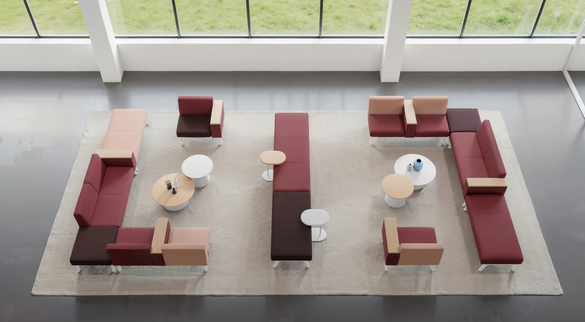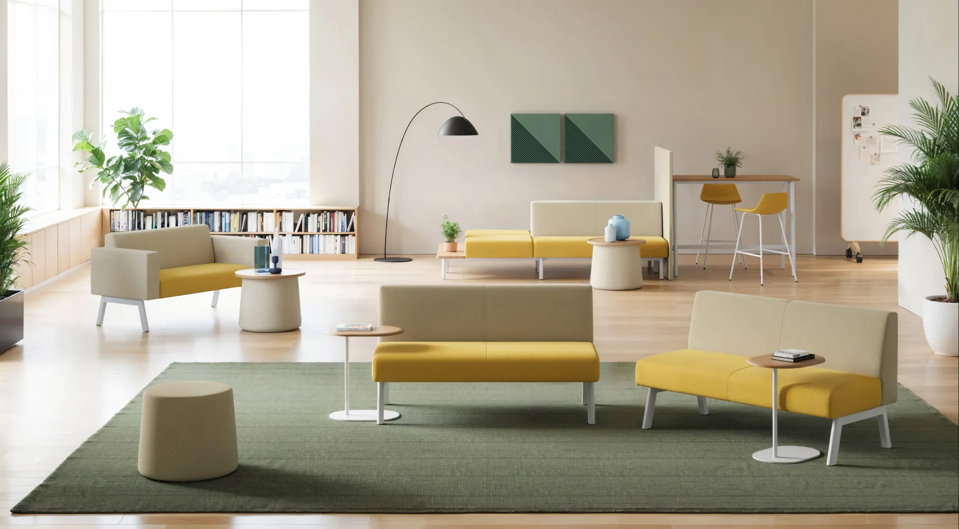 Through the use of color and modular design, a shared space is created that combines social functionality with a comfortable experience.