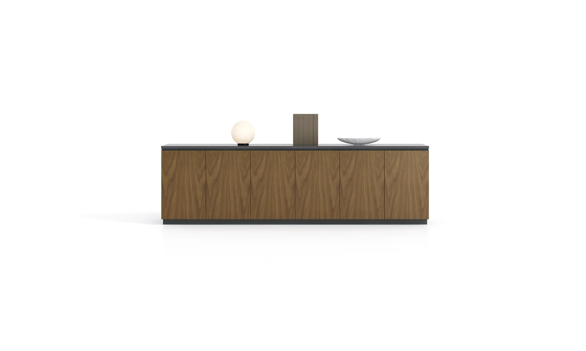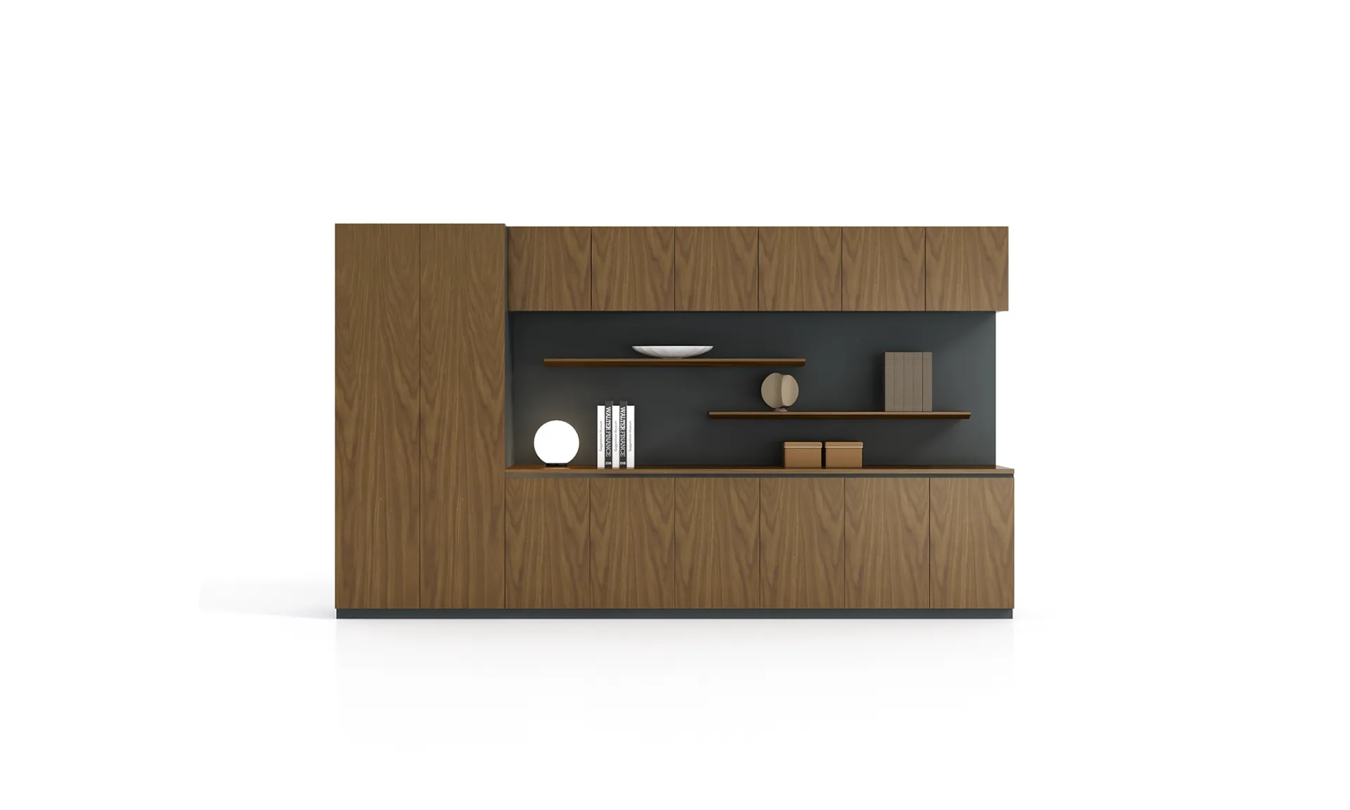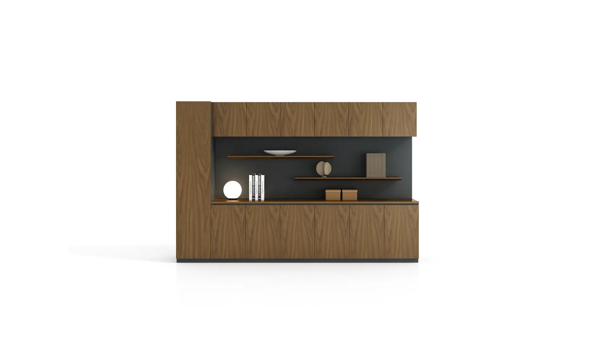 隐藏式柜门保障收纳整洁,开放式层架展示品味,整面墙的设计让空间更具秩序感